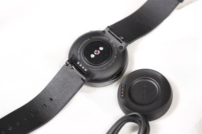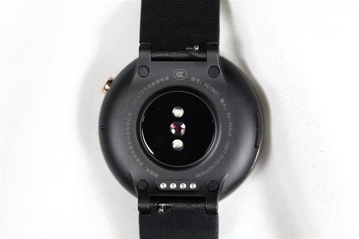 这是表盘的背部,放置喇叭孔、心率传感器和配套磁吸式充电器的金属点。其中的心率传感器为华米自研的全新BioTracker PPG生物追踪光学传感器。如果是配备黄山1号芯片的版本搭载的为ECG心电传感器。