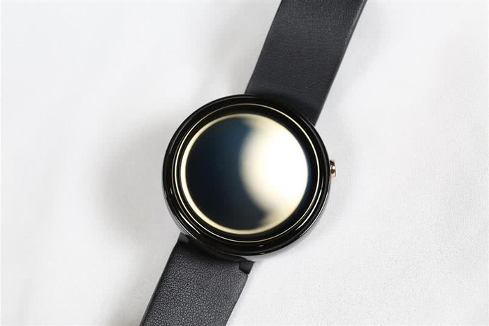 未亮屏状态,一体性极佳,观感如一块玉璧。可以观察到整块屏幕呈现出边缘向中心进行弧状过渡的趋势,有时像一滴水荡漾在表盘中央,有时又如上图可见月牙状的光影相交。这种设计被华米称之为“2.5D水漾显示屏”。