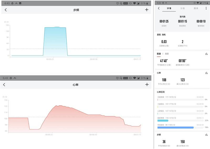 以室内跑为例,在完成运动之后数据会同步到App端,可以直接查看相关运动数据,包括时间、步数,以及卡路里、心率、配速等各项关键的运动数据。