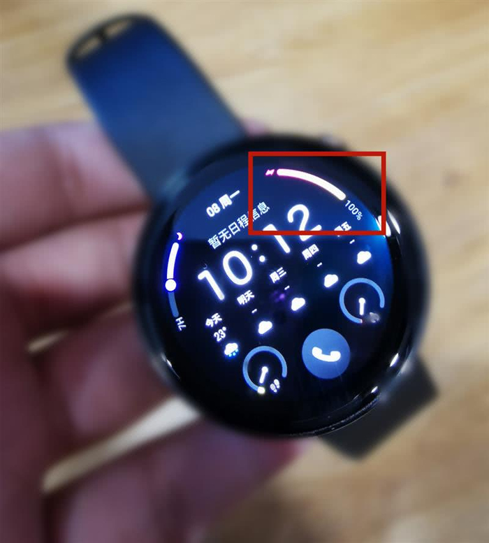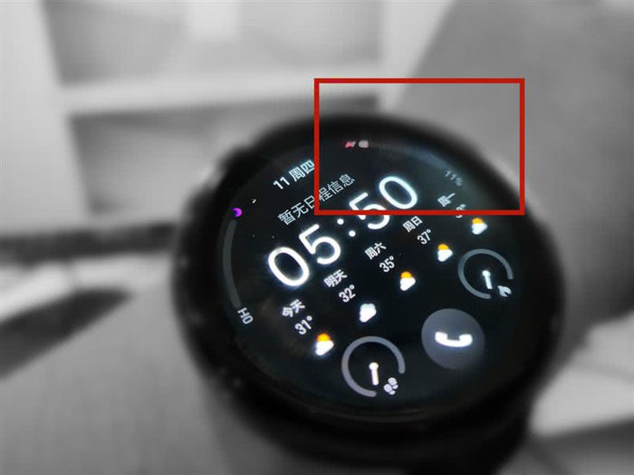 这是整块手表唯一的实体按键,其承担home键、返回等交互,除了操作实体按键,我们还可以通过上下左右滑动表盘屏幕来进行功能切换。