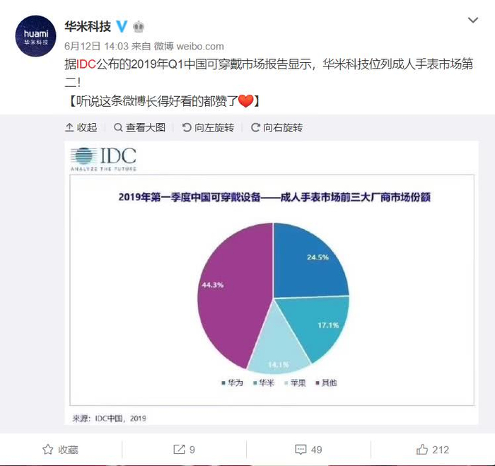 此外,华米在国内市场的地位是统治级的,据IDC公布的2019年第一季度《中国可穿戴设备市场季度跟踪报告》,彼时中国可穿戴设备市场出货量为1950万台,同比增长34.7%。在成人手表市场,华米科技凭借17.1%的份额赢得国内市场第二的位置。
