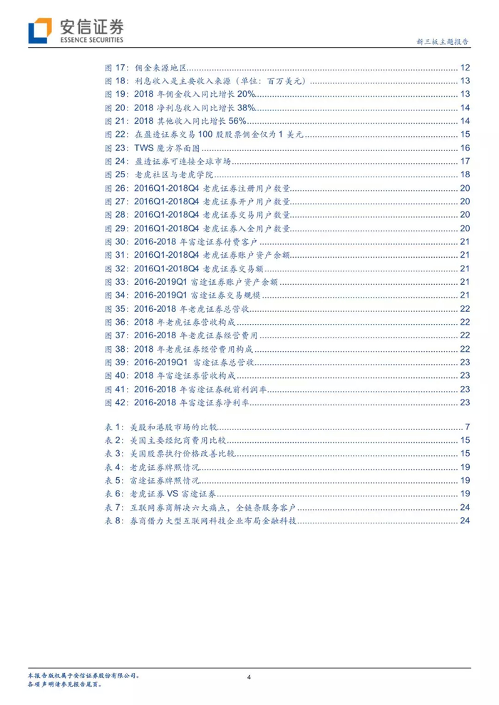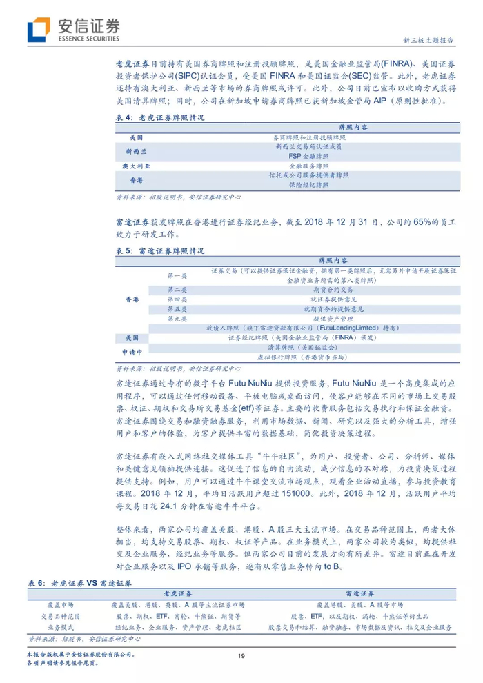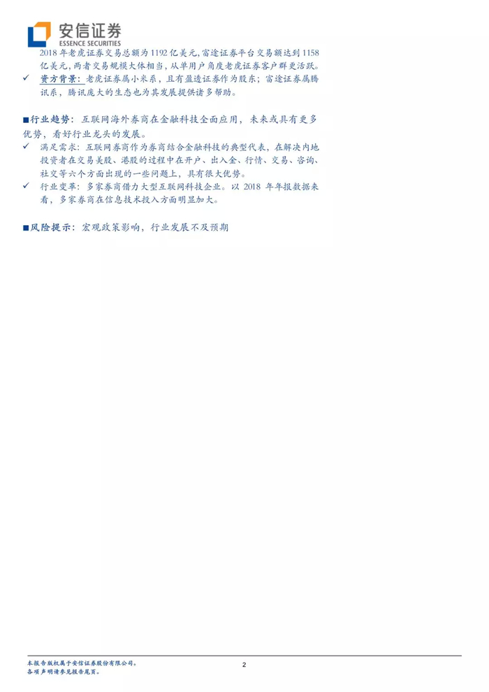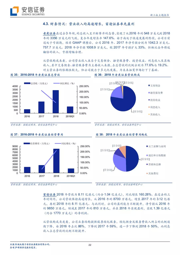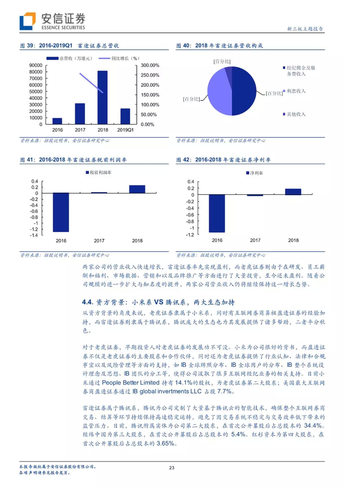 两公司营收快速增长,富途证券率先盈利。富途证券2018年,营收约为1.04亿美元,同比增长160.28%;2018年实现盈利,净利润约1770万美元。老虎证券2018年总收入为3356万美元,复合年度增长率147.6%;经非GAAP调整后,2017年净亏损757.7万美元,2018年净亏损1008.9万美元,较上年亏损扩大33%,但相比全年将近翻倍的收入,亏损增幅合理。