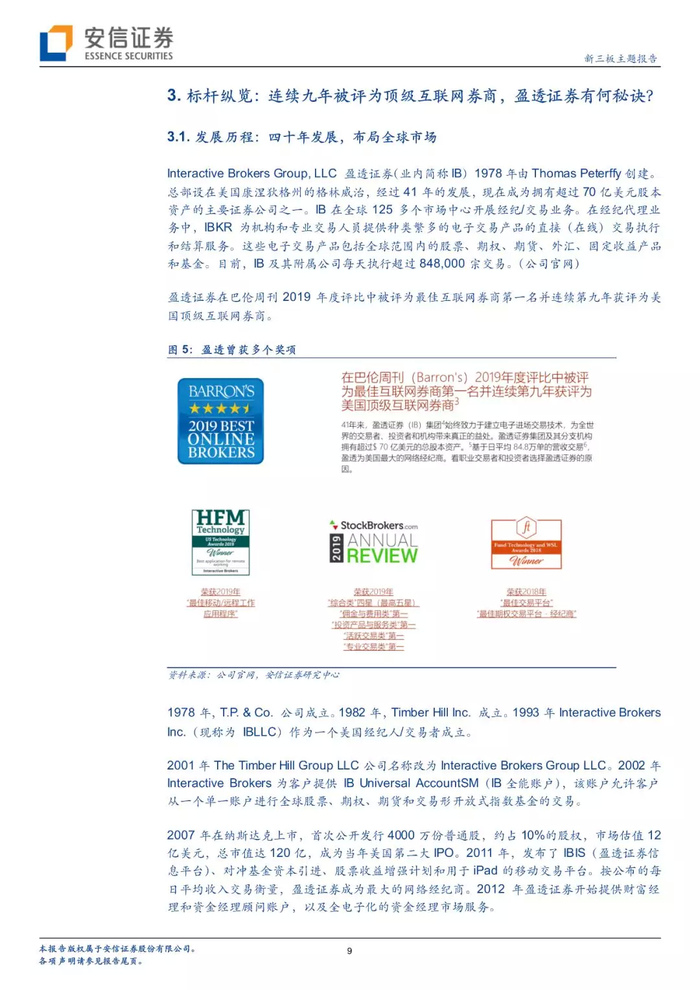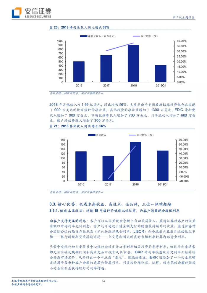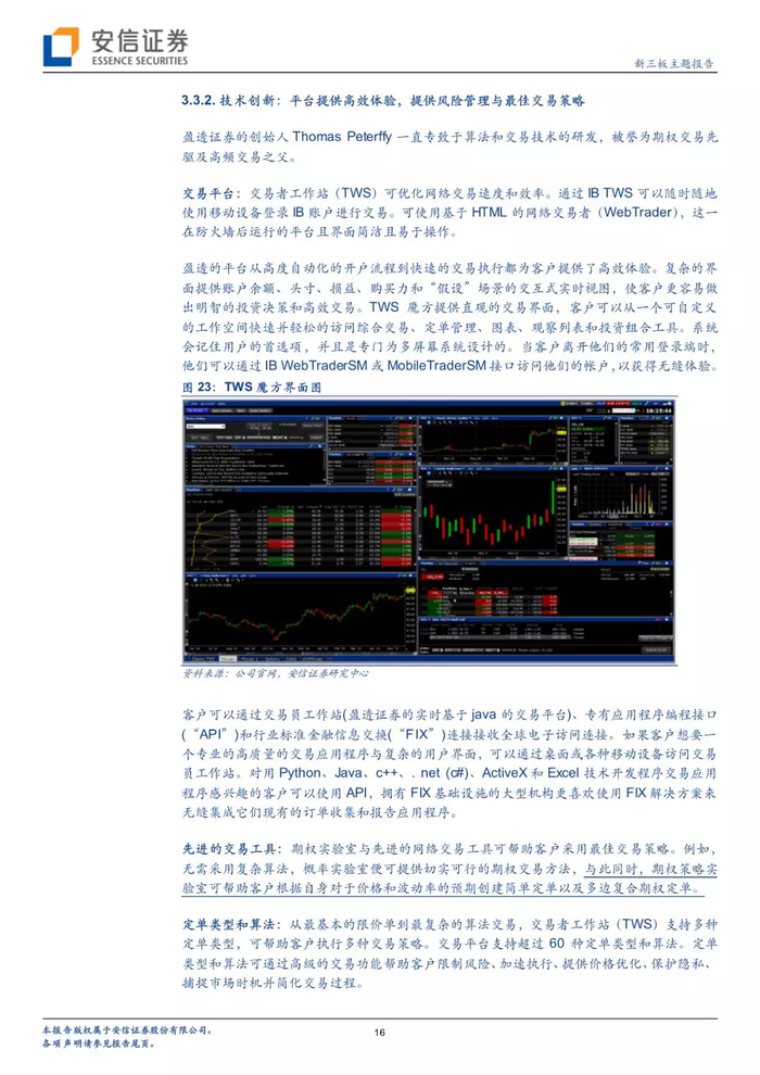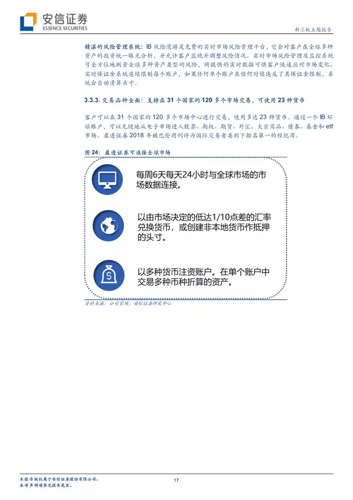 行业巨头盈透证券在全球125多个市场中心开展经纪/交易业务,主要业务为电子经纪业务,利息收入为主要收入来源。盈透证券可交易的品种齐全,客户可以在31个国家的120多个市场中心进行交易,使用多达23种货币。通过一个IB环球账户,可以无缝地从电子市场进入股票、期权、期货、外汇、大宗商品、债券、基金和etf市场。盈透证券的佣金较低,连续18年被美国巴伦周刊评为低成本经纪商,为客户闲置账户资金提供利息。技术先进,盈透的平台为客户提供了高效体验,提供风险管理服务。目前,IB及其附属公司每天执行超过848,000宗交易。