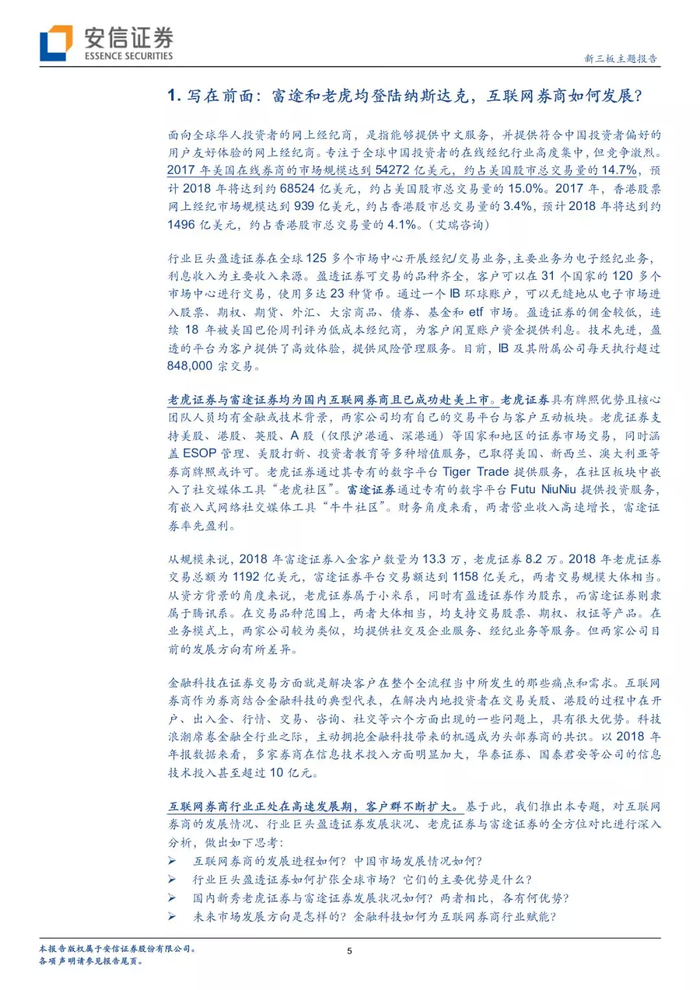 互联网券商行业正处在高速发展期,客户群不断扩大。基于此,我们推出本专题,对互联网券商的发展情况、行业巨头盈透证券发展状况、老虎证券与富途证券的全方位对比进行深入分析,做出如下思考: