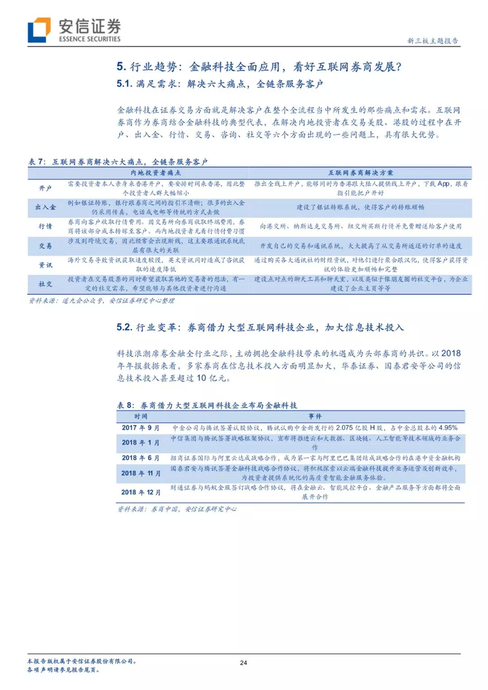金融科技在证券交易方面就是解决客户在整个全流程当中所发生的那些痛点和需求。互联网券商作为券商结合金融科技的典型代表,在解决内地投资者在交易美股、港股的过程中在开户、出入金、行情、交易、咨询、社交等六个方面出现的一些问题上,具有很大优势。科技浪潮席卷金融全行业之际,主动拥抱金融科技带来的机遇成为头部券商的共识。以2018年年报数据来看,多家券商在信息技术投入方面明显加大,华泰证券、国泰君安等公司的信息技术投入甚至超过10亿元。