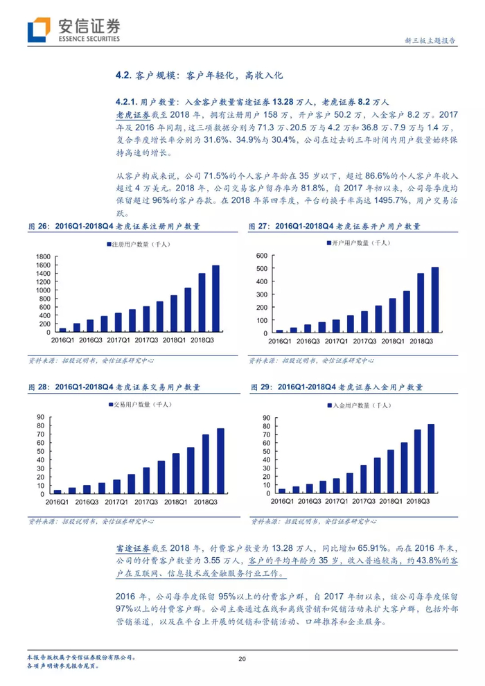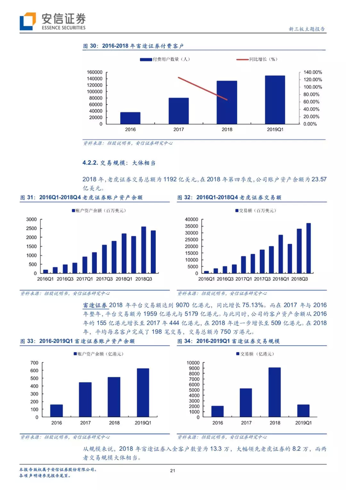 2018年富途证券入金客户数量为13.3万,老虎证券8.2万。2018年老虎证券交易总额为1192亿美元,富途证券平台交易额达到1158亿美元,两者交易规模大体相当,从单用户角度老虎证券客户群更活跃。