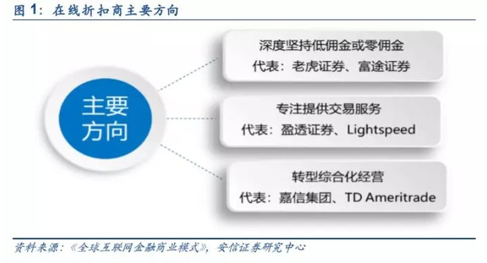 目前在线折扣券商可以分为以下3个方向:深度坚持低佣金优质服务、专注提供交易服务、转型综合化经营。