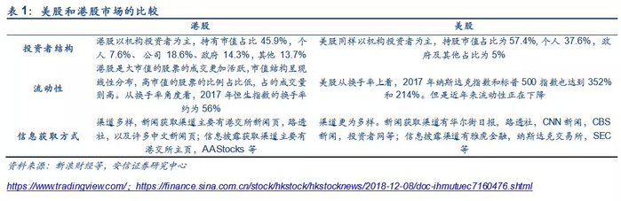 美股与港股均为较发达的股票市场,对比两个市场,从投资者结构来看,美股市场与港股市场相近,但美股的机构投资者持股市值占比更高;从流动性来看,美股市场流动性显著高于港股市场;从信息获取方式来看,美股信息渠道更为广阔,对用户而言更为实用。