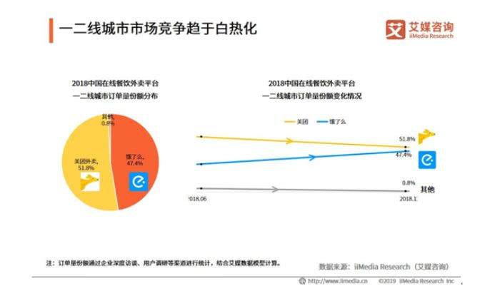 去年6月份美团在港交所披露招股书时,饿了么曾高调宣布计划暑假期间投入30亿元人民币,在用户补贴及市场营销上,彼时外界认为外卖市场可能迎来又一次补贴战争,艾媒咨询今年4月底发布《2018-2019中国在线外卖行业研究报告》显示,饿了么和美团在一二线城市的竞争更趋激烈——2018年,一二线城市订单份额分布中,饿了么份额已经达到47.4%,两者之间份额已经持平。