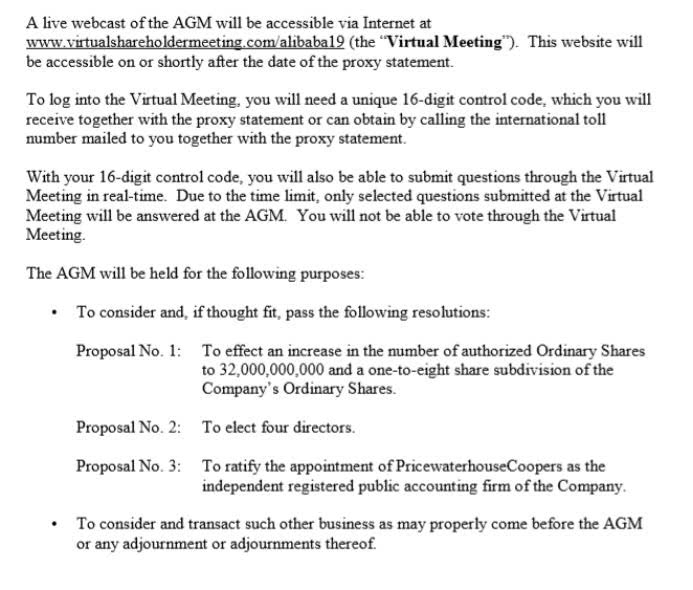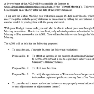 7月15日晚上9点,阿里巴巴在香港时代广场办公室举行股东会议,据时报君拿到的会议资料显示,本次股东大会主要围绕三点进行: