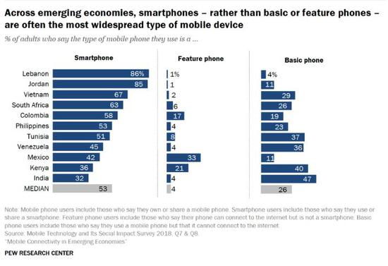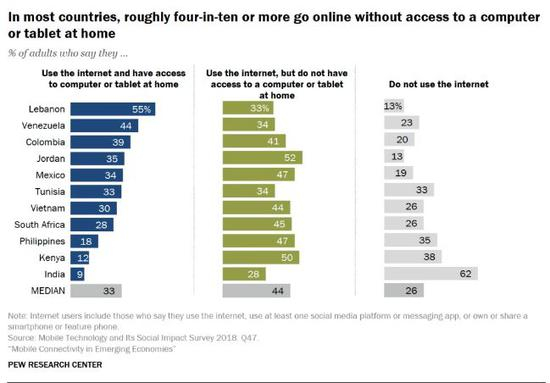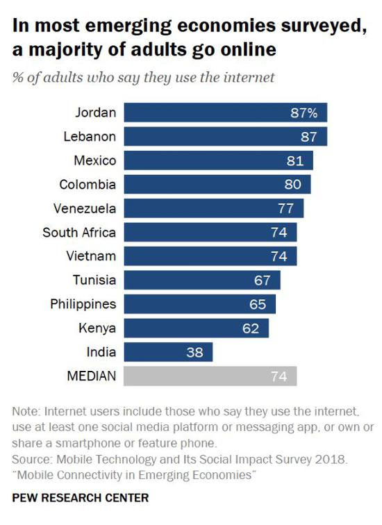 2018年,美国皮尤研究中心选取了越南、约旦、突尼斯、哥伦比亚、肯尼亚、黎巴嫩、南非、墨西哥、菲律宾、印度、委内瑞拉11个典型新兴和发展中国家为调查对象,跟踪调查其目前互联网使用情况。