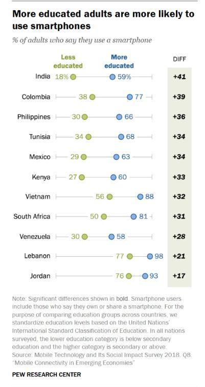 数据显示,由教育差距导致的智能手机使用情况最为突出的是印度。中等教育以下与中等教育及以上群体智能手机使用差达41%,居11个国家之首。