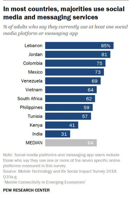 https://www.pewinternet.org/2019/03/07/use-of-smartphones-and-social-media-is-common-across-most-emerging-economies/