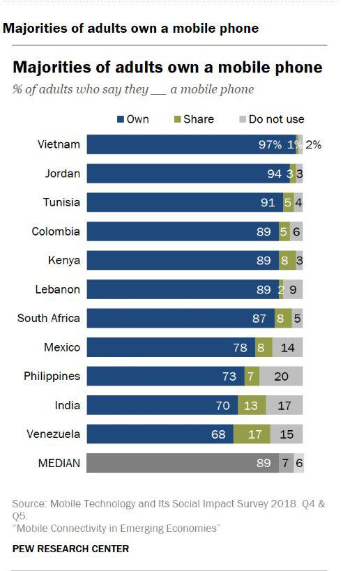 2018年,皮尤数据显示,接受调查的11个新兴和发展中国家的成年群体中,拥有手机比例最高的国家是越南,有97%的越南成年人有手机。拥有手机比例最低的国家是来自南美洲的委内瑞拉(68%),其余32%的委内瑞拉成年人中,17%的与他人共享手机,15%的不用手机。