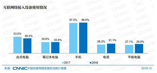 互联网接入设备方面,我国网民使用手机上网的比例达98.6%(手机网民规模8.17亿),使用台式电脑、笔记本电脑上网和平板电脑上网的比例分别为48.0%、35.9%和29.8%,使用电视上网的比例为31.1%。