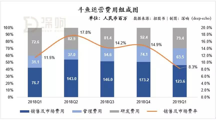 而在运营费用方面,斗鱼在2019年一季度大幅度降低了销售及市场费用的投入,虽然相比较去年同期仍有较大幅度增长,但销售费用率相比较去年全年仍为最低水平。