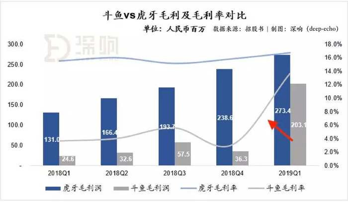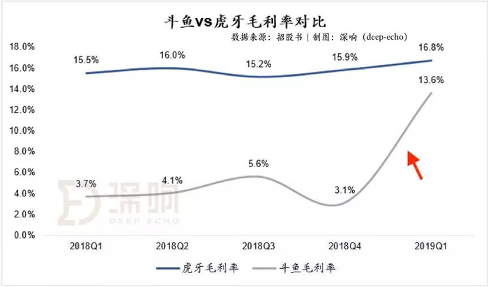 「深响」在对比斗鱼和虎牙财务数据时,也发现了一个比较有意思的现象——对于虎牙,其公司历史毛利率水平相对稳定,一直以来处于15%以上,而斗鱼的毛利率在过去几个季度均在5%上下浮动,却在2019年一季度直接拉升至13.6%,已经比较接近虎牙的历史平均水平。