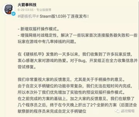 这应该只是穆飞的一时情绪。不过火箭拳工作室确实因此陷入了迷茫,选择也开始变得被动。6月29日,《硬核机甲》在发售后的第二天推出更新,而补丁内容的核心,便是玩家呼声强烈、但主创们早前就已否定掉的‘双摇杆操作模式’。