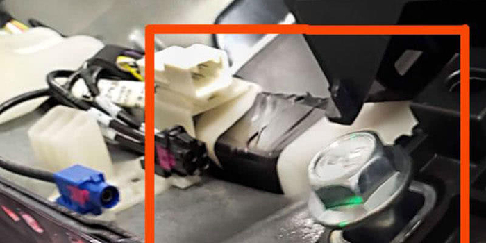 例如,这张照片显示的是贴在白色塑料外壳上的胶带,它将“三凸轮”连接件固定在Model 3内部的适当位置上。阿兰达说,这种塑料外壳的边缘在安装过程中会经常开裂,因此要经常用胶带进行固定。