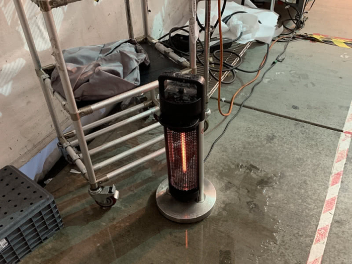 卡洛斯·阿兰达(Carlos Aranda)说,在GA4有一个工作站,用来检查Model 3定位。2018年年末时员工曾用小型取暖器取暖,结果下雨的时候水渗入帐篷,流了下来,演变成一场灾难。阿兰达分享一组照片,从照片可以看出帐篷顶漏水,地上放着取暖器,插在插座上,雨水在附近打转。