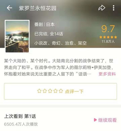 去年京阿尼推出的一月番《紫罗兰永恒花园》在开播当天零点由B站开始播送,开播仅20多分钟后,在线观看人数就突破12万,评论达到1.6万条。截至目前,该番剧在B站的播放量达6500万,B站评分达9.7分。