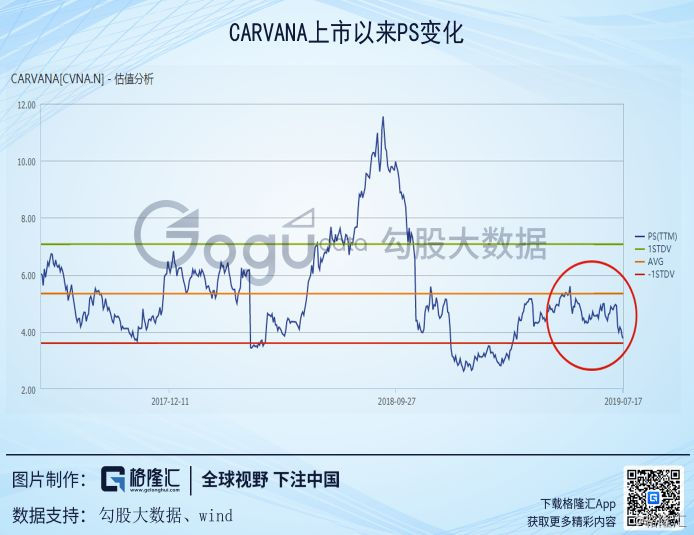 核心是估值。两家电商类公司目前均处于高速增长阶段,还没实现盈利,PS能更好地反应当前这两家公司的的估值差异。据WIND数据显示,截至2018年7月18日收盘,优信的PS为1.29,Carvana的PS为3.77。