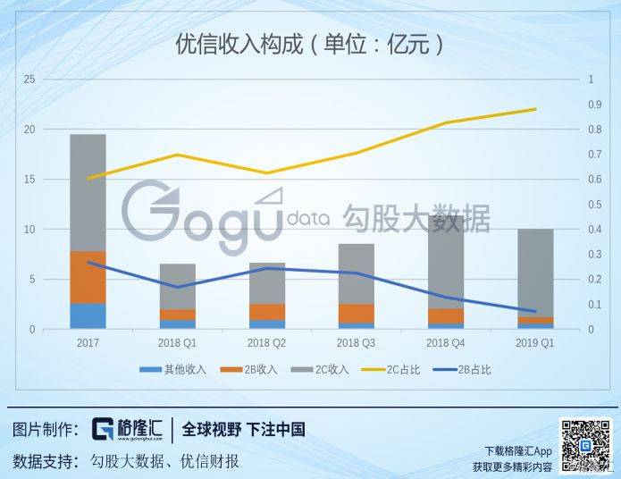 从2017年以来,其分部业务增长出现了明显分化,其中2B业务在营收贡献度及增速方面均出现下滑,而2C业务却异军突起,已成业务发展主引擎。