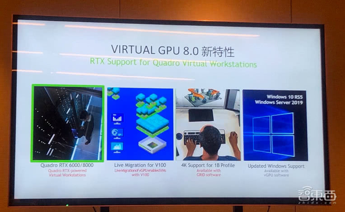vGPU是一款针对虚拟场景而设立的纯软件产品,最新的RTX GPU和vGPU 8.0,为影视娱乐、制造业、建筑业等很多行业更好地提供RTX技术。通过vGPU,用户可以动态改变GPU的用途,只将一部分GPU的算力独立分配出来执行特定任务。“就像自助蛋糕一样,用户可以根据需求拿不同口味、不同分量的蛋糕。”