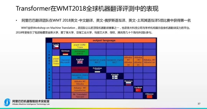 2017年的WMT竞赛,大多数系统是基于RNN和LSTM,包括最终获得冠军的系统也是基于此。仅仅过了一年时间,各大机构都争先使用Transformer。达摩院机器智能技术实验室资深算法专家陈博兴带领的达摩院机器翻译团队,在此次比赛中,基于Transformer结构, Self-Attention、Multi-head Attention等技术,进行了网络结构的改进,充分利用词语位置信息,提出高度并行化、能捕捉层次化信息的神经网络,全面提升了机器翻译的性能。