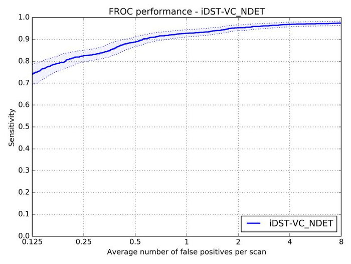 2017年7月,国际权威肺结节检测大赛LUNA16 要求选手对888份肺部CT样本进行分析,寻找其中的肺结节。样本共包含1186个肺结节,75%以上为小于10mm 的小结节。最终,阿里云ET在7个不同误报率下发现的肺结节平均召回率达到89.7%。(召回率指在样本数据中成功发现的结节占比,下图显示了ET在不同误报次数下的召回率情况。)