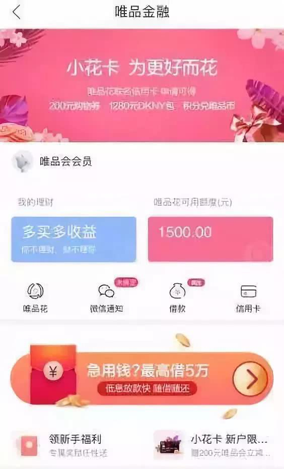 2016年10月,互联网第三方支付正热时,唯品会全资收购浙江贝付科技有限公司,获得第三方支付牌照,开展支付业务。随后陆续上线“唯品花”、“唯品宝”和“唯爱宝”几款产品,其中“唯品花”作为拳头产品,形式和京东白条、蚂蚁花呗、苏宁金服等“先消费、后付款”的模式相似度与重合度都较高。