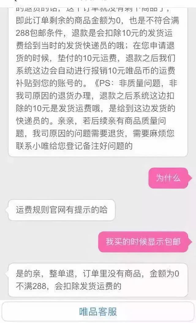 有消费者称,自己在唯品会退货时需要支付双倍运费(即发货运费从商品单价中扣除,退货运费也需要支付),如果不选择品骏物流退货的话,则要支付更高昂的快递费。这对于唯品会来说,或许可以节约逆向物流带来的费用成本(唯品会的退货率约30%),但对于消费者来说却是劝退的导火索。