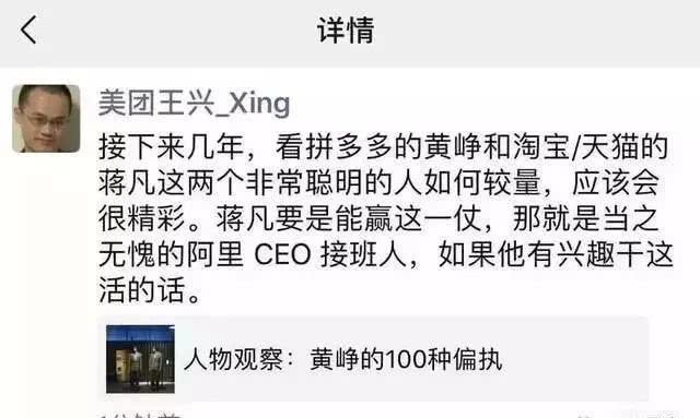 美团创始人王兴更是在朋友圈将其看做阿里未来CEO的接班人,原话是,“接下来几年,看拼多多的黄峥和淘宝&天猫的蒋凡这两个非常聪明的人如何较量。蒋凡要是能赢这一仗,那就是当之无愧的阿里CEO接班人。”