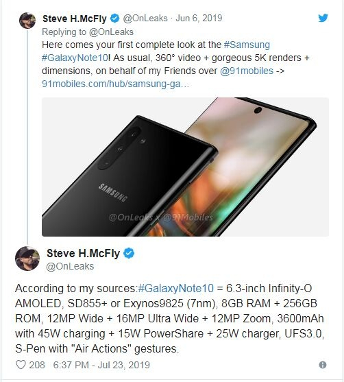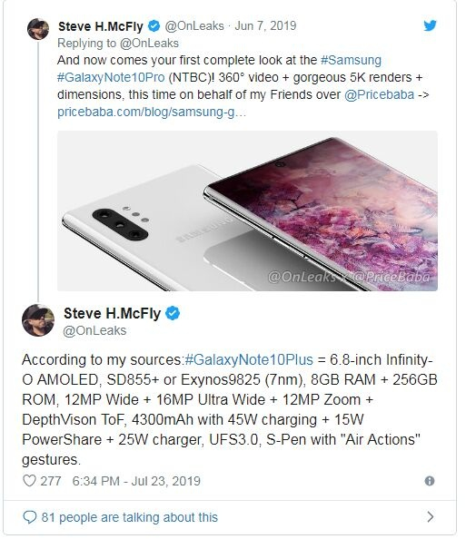 Note 10规格由知名爆料Steve H. McFly在两条推文中发布。最大的启示?事实上,这两款手机都采用了更高功率的骁龙855 Plus芯片组,这与先前的报道相反,声称他们将获得标准的骁龙855。
