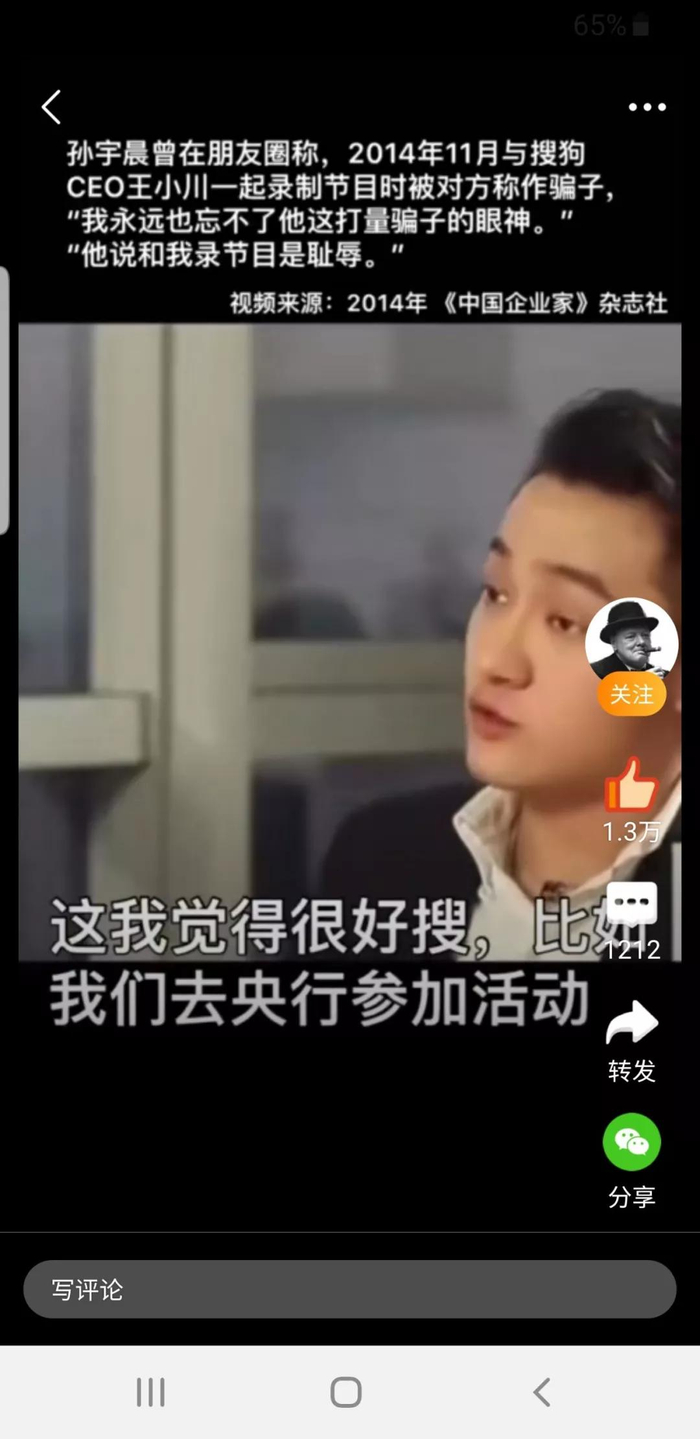 拍下巴菲特午餐后的孙宇晨,似乎获得了传统意义上的“成功”。其鄙视王小川的朋友圈流出:2014年一起录节目时,“我永远也忘不了他这打量骗子的眼神,他说我是骗子,肯定会失败,和我录节目是耻辱,最后甚至没法录下去。后来不到三年我公司就超过搜狗市值。人生中,瞧不起你的人对你的鞭策更加刻骨铭心。”
