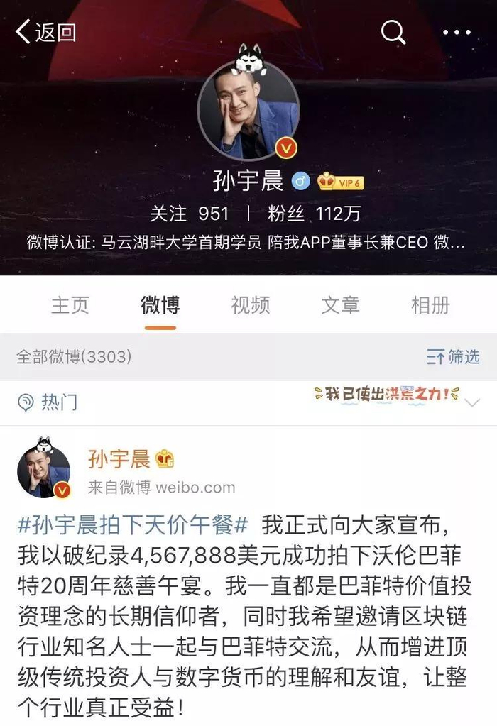 自从6月4日宣布以456万美元(约人民币3142万元)天价成功竞拍巴菲特午餐以来,这位争议不断的90后多次承包热搜:怼王思聪、怼搜狗CEO王小川、拍下巴菲特午餐、辟谣巴菲特午餐取消。近日,孙宇晨更是跳出来称要拿1000万支持小鹏汽车消费者维权,更称要邀请不看好比特币的美国总统特朗普参加巴菲特午餐。虽然这听起来就是天方夜谭。