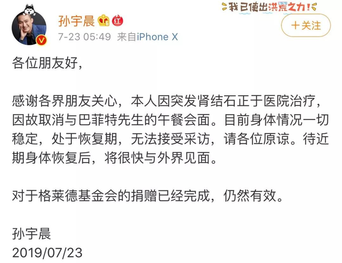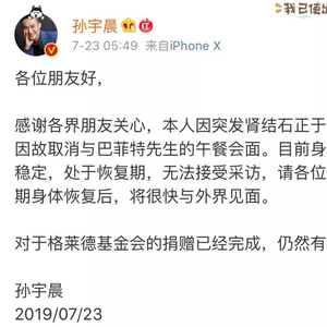 7月23日一早,孙宇晨称因突发肾结石在医院治疗,取消与巴菲特午餐会面。
