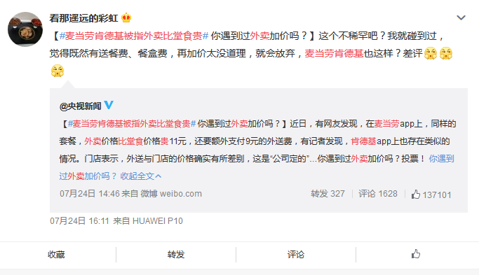 从平台上下单,麦当劳的送餐费很贵,据说外卖员抽成很高。看起来,外卖员从消费者那里赚了多少钱,这只是绩效考核的策略。外卖行业初兴起之时,流行过免费送餐,而外卖员拿的是高工资。今天外卖平台还有大量类似情形,难道外卖员就白白服务吗?显然不是。