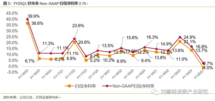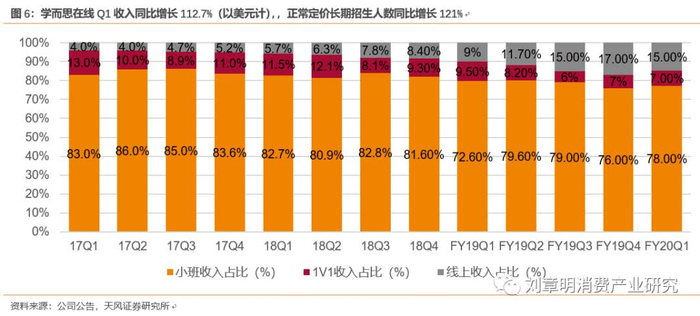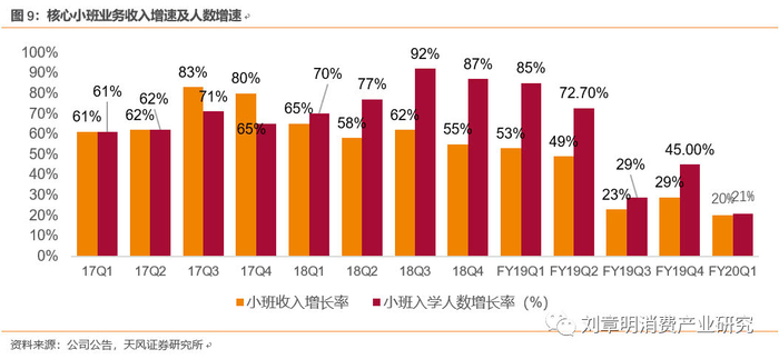 FY20Q1小班营收以美元计+14%YoY,学员+22%YoY;智康1v1收入以美元计增长21%。FY20Q1核心小班业务(包含培优小班,励步,摩比)占总收入78%,FY17Q4-FY19Q4分别为83.6%、82.7%、80.9%、82.8%、81.6%、72.6%、70.5%、79%、76%。