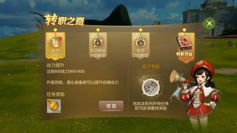 玩家转职需要完成一系列的任务,先要满足战力的需求,再完成采集矿石等生活职业任务,最后镶嵌规定的龙符,就可以进行转职。