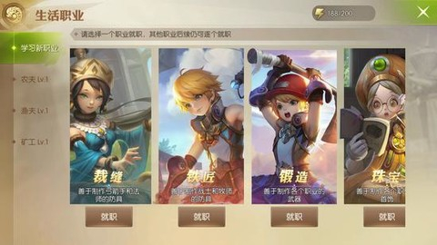 除了战斗外,在地图中还有药草、矿物等物品进行采取。进行这些操作可以提升对应生活职业的经验,升级后可以采取更高级的采集点。基础生活职业共有农夫、渔夫、旷工三种。初期可以在裁缝、铁匠、锻造、珠宝、炼金中选择一种就职,其他生活职业可以在后续解锁。可以根据自己的职业优先选择对应的生活职业,比如战士可以选择铁匠来就职。