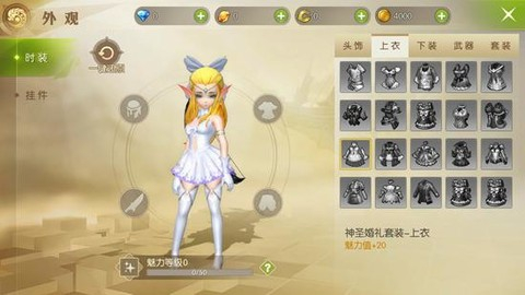 游戏有着丰富的时装,目前共有包括20种头饰、20种上衣、11种下装、15种武器,共20套时装。除了套装外,还有45种翅膀挂件可供选择。这些时装除了外表好看外,还可以增加游戏内的魅力值。
