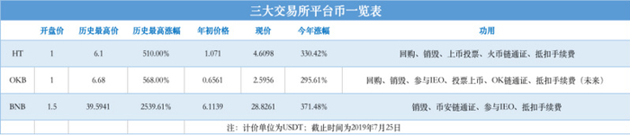 直到后来,平台币价格开始暴涨。BNB 突破历史前高,OKB 与 HT 也于本周一(7 月 22 日)创下年内新高,三大平台币今年涨幅均超过比特币最高涨幅(270%)。