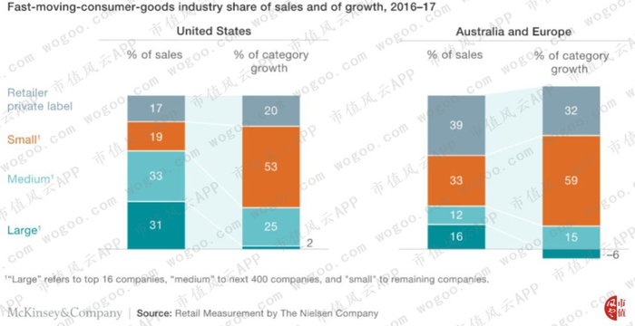 2017年,市场调研公司Nielsen将快消品公司分为四大类:行业巨头(前16大公司)、中等(接下来的400家公司)、小型(剩余公司)、以及零售商自有品牌。