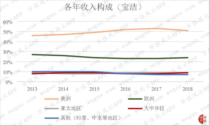 与之相比,虽然区域划分有很大区别,但是竞争对手宝洁公司的重点市场明显偏向于北美本地,这或许也是造成宝洁公司面临的市场环境更加恶劣而不得已大动干戈的原因。