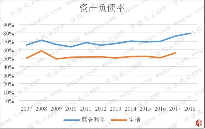 和竞争对手宝洁相比,联合利华的资产负债率较高,且持续上涨,2018年上升到80%。