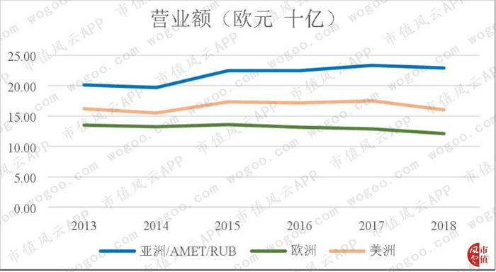 从2013至今,公司在欧洲地区的营业额有微量下滑,在美洲的销售额相对稳定,在亚洲市场有所上升。