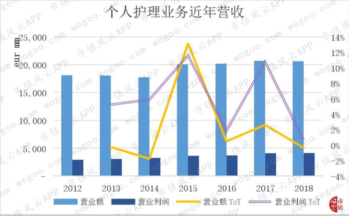 个人护理近年营业利润维持了正增长。2018年,该板块营业额206亿欧元,同比减少0.4%,营业利润41亿欧元,营业利润率降低0.7%。