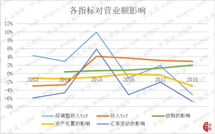 可以看出,收购对公司近年来收入的影响各年均在2%以内。2018年,收购的正面影响尚不及资产处置或是汇率变动对收入的负面影响。