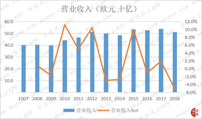 2018年公司营业收入为510亿欧元,较2017年同比减少5.1%。对比2008年,CAGR为2.3%。